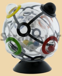 Задача: расположить цветные шарики, находящиеся внутри самой маленькой прозрачной сферы в лунки соответствующего цвета на самой большой, внешней сфере. Сложность в том, что между внутренней и внешней прозрачной сферой крутится средняя по размеру сфера, у которой всего 2 отверстия-выхода, через которые и нужно "провести" цветные шарики в процессе их пути наружу, в цветные лунки внешей сферы!