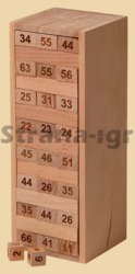 Высота 24 см Размер брусков 7,7 на 2,5 на 1,5 см Размер основания (в собранном виде) 9 х 8,3 см В комплекте 45 брусков Материал бук Количество игроков 2-4 Производитель Россия