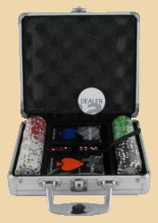Фишки для игры в покер 100 шт, по 14 грамм Диаметр фишек 39 мм Номинал фишек 5$-25 шт, 10$-25 шт, 25$-25шт, 50$-25 шт, Фишки выполнены из керамики, на обоих сторонах нанесены высококачественные голографические наклейки с номиналом фишек Две колоды карт с пластиковым покрытием, по 54 листа в колоде, покерный размер, увеличенный индекс "Кнопка" дилера Кубики 5 шт Алюминиевый дипломат Размер 6,5 на 19,5 на 20 см Производство Китай