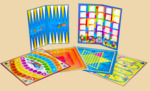 Комплектация: - игровые поля (двухсторонние) 6 шт.; - шашки 32 шт.; - наклейки на шашки (шахматы) 32шт. (8 наклеек в рамках запасные); - кубики с точками 3 шт; - кубики цветные 2 шт.; - фишки (красные, желтые, зеленые, синие) по 16 шт. каждого цвета; - фишки (оранжевые и фиолетовые) по 10 шт. каждого цвета); - жетоны 13 шт.; - колпачки четырех цветов 12 шт.; - "батут" сборный из картона 1 шт.; - катапульты 4 шт.; - парные карточки маленькие 26 шт.; - парные карточки большие 30 шт.; - правила 1 шт. Производитель Россия
