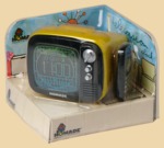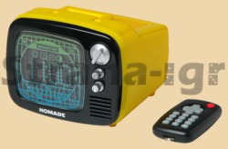 Часы имеют оригинальную форму старого доброго телевизора с пультом дистанционного управления. На экране телевизора вы можете видеть время, а также с часами можете насладиться мелодиями из еле-передач. С помощью пульта ДУ вы можете отключить экран, чтобы сделать полную темноту и насладиться сном. Корпус часов сделан из пластика желтого и черного цветов. Для удобства у будильника есть ручка для переноски. Будильник оснащен ЖК-дисплеем и кнопками для установки времени.