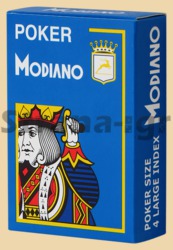 100% пластиковые карты для игры в покер. Игральные карты Modiano удобные и надежные, устойчивые к повреждениям и выцветанию, их можно даже мыть. Игральные карты Modiano Cristallo имеют четыре увеличенных индекса, что позволяет игроку приподнимать карту для просмотра с любой стороны, а достоинство карты хорошо видно всем игрокам во время хода. Карты Modiano в отличие от абсолютно гладких карт имеют текстурированную поверхность. Карты не скользят по столу, и не выпадают из рук. Количество карт в колоде: 54 листа (52 + 2 джокера). Рубашка: синяя. Лицо: стандартные по цвету карты, две красные и две черные масти. Индекс: 4 увеличенных индекса (Jumbo Index). Размер карты: покерный (Poker Size) / 2,5 х 3,5 дюйма (63,5 х 88,9 мм). Материал: 100% пластик. Производитель: Modiano, Италия.