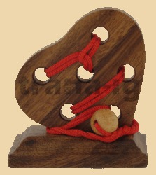 Задание - вытащить шнурок из сердца Размер головоломки 8 на 8 см, толщина 1 см Уровень сложности 2 из 5 Материал тропическое дерево, верёвка Производитель Индонезия